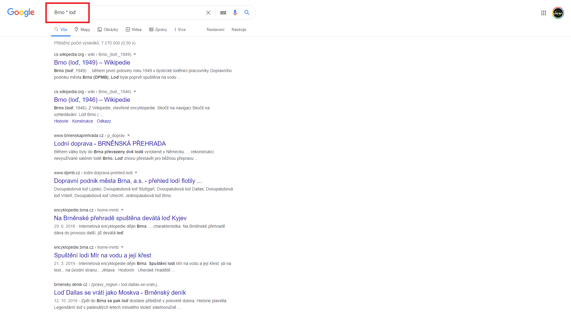 • Hvězdička – například Brno * loď vyhledá takové stránky, které obsahují obě zadaná slova a mezi nimi libovolný počet slov (jedno a více)